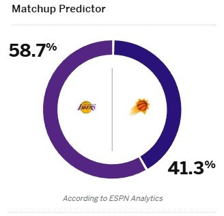 今日ESPN晒出本场获胜概率预测,湖人58.7%,太阳41.3%。